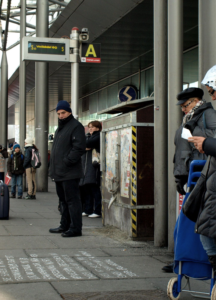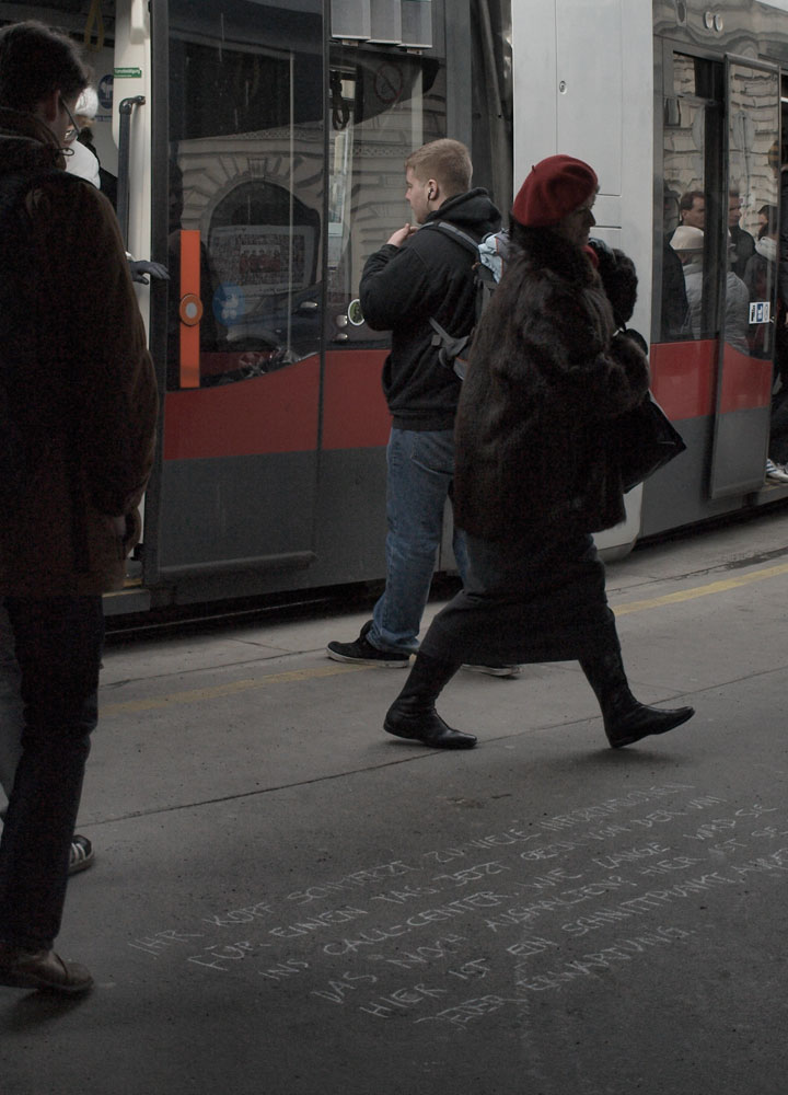 "Common Secrets" deals with non-places*, in particular with the intersections of public transport systems. Negative aspects like solitude, similarity, latency, anonymity and the lack of relationships are given a new interpretation. Solitude and similarity offer privacy. Latency can be seen as a break, a possibility to rest. Anonymity frees a person from role models and social restraints. The lack of true relationships is a chance to put the focus on oneself. Short texts, written on the tram platform, were used to transport this new interpretation. Each text tells a story of a person. He/she is leaving a role, for example the role of a student, who is about to enter a new role, the bartender.