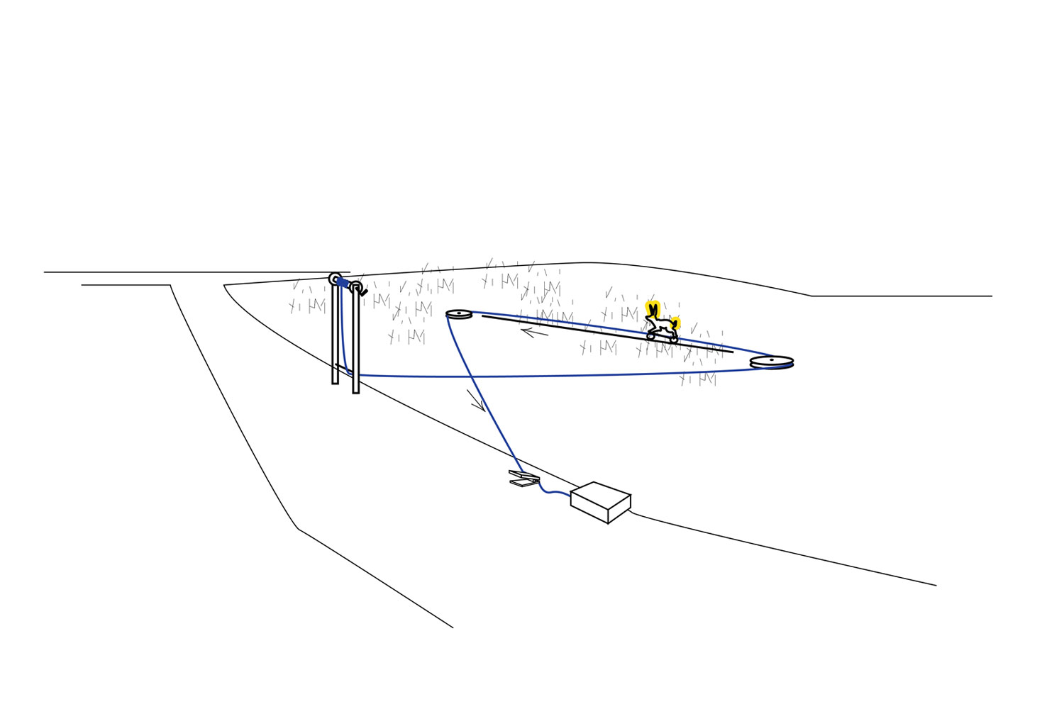 The “Happy machine” is an interactive installation. It deals with the mechanical repetition of a spontaneous, happy event. Mixing the unexpected, happy event with the reliability of a machine, creates an absurdity, that questions the importance of coincidence. The “Happy Machine” creates the well known picture of two bunny ears and a small white tail in a meadow. The spectator initiates the bunny to hop, by releasing a mechanism. The rabbit hops for the visitor, as often as he wants. The person gains control over a situation.