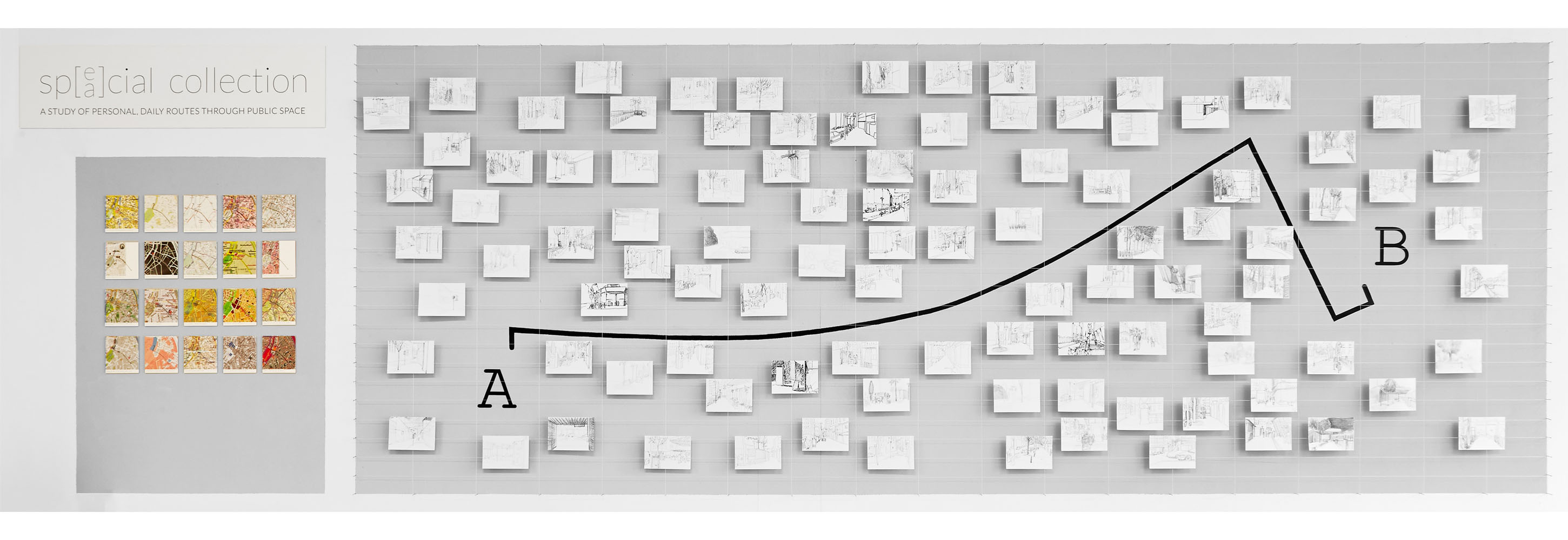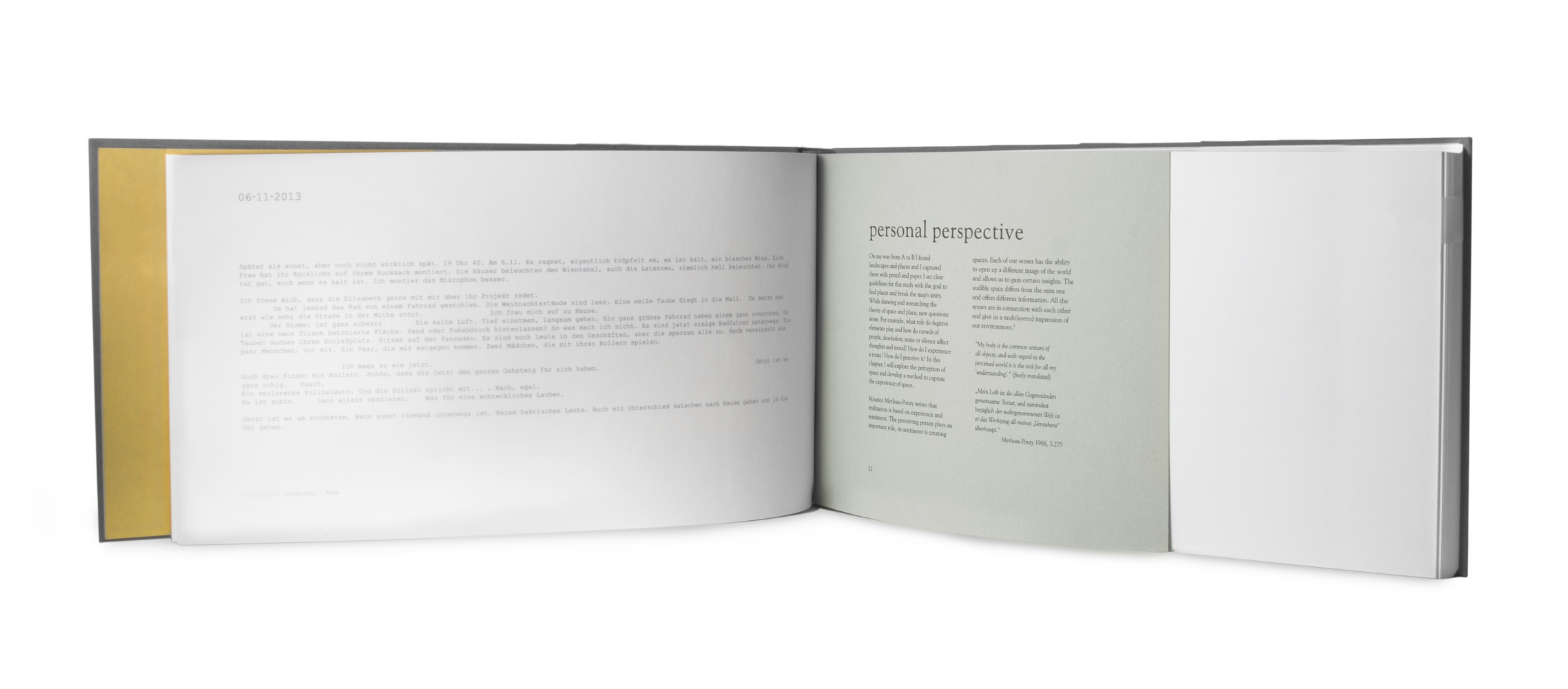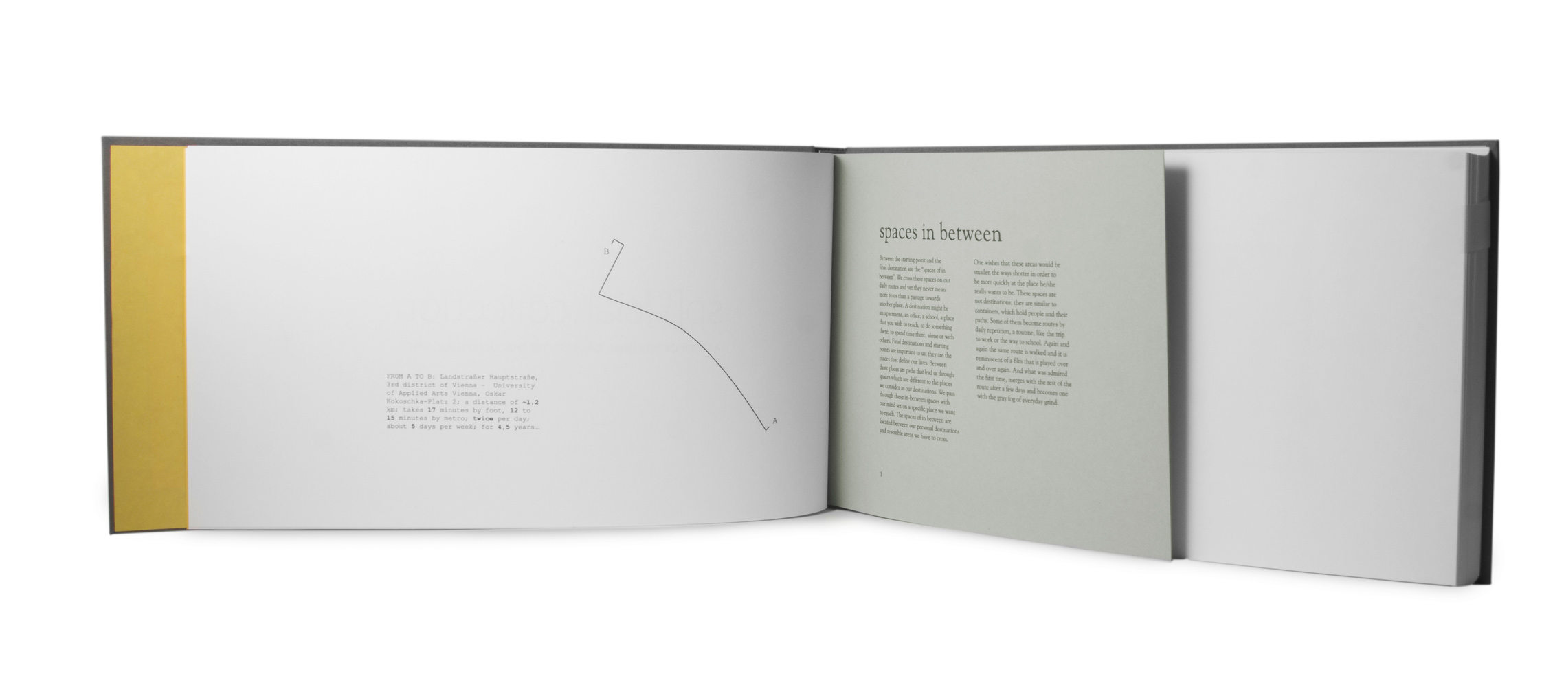 The diploma project “special, spacial collection“ focuses on everyday spaces and personal routes through public, transitional spaces between two destination points. The objective of this project is to approach transition spaces in a personal manner, to explore what a person can find along an everyday route and how this influences space and person. A book combines executed artistic studies and theoretical research, to communicate the results of this study.