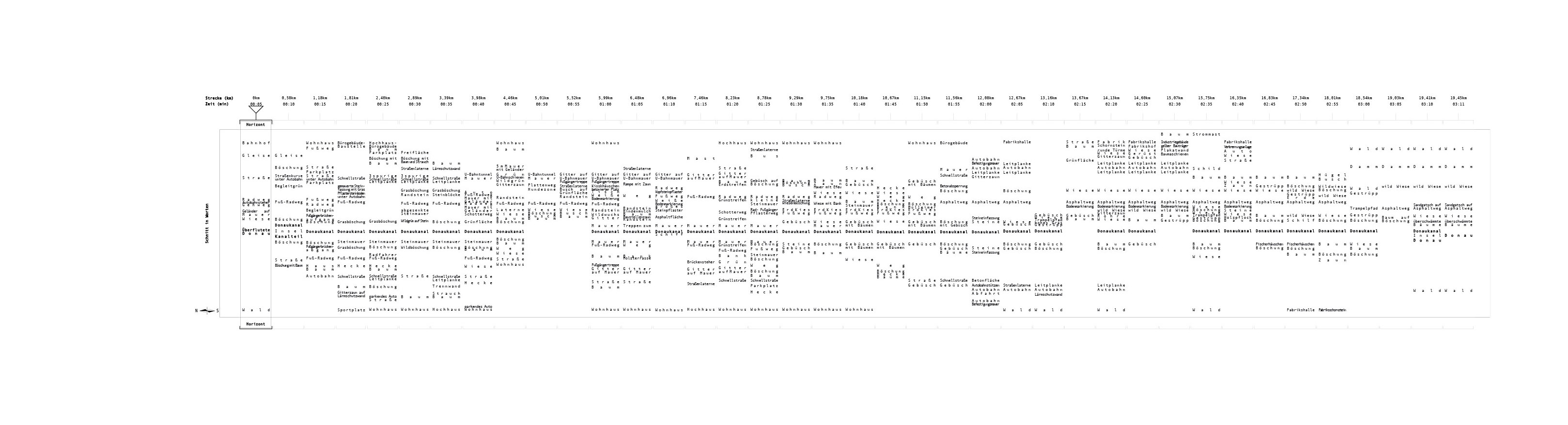 “Cutting through the Danube Channel” is a repetitive description of the objects along the Danube Channel in Vienna. Every 5 min the surrounding from horizon to horizon is described. By repeating this act a collection of words is formed. Words witch have a certain location on the paper. A word map was created that shows how the landscape around the channel changes. It is a pattern of moving words and a repetitive structure. The reader has to interpret the words in the map and follow the Danube channel from it's origin thill it's end.