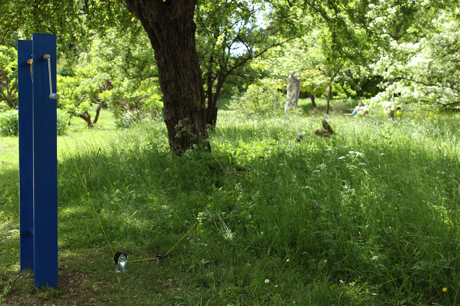 The “Happy machine” is an interactive installation. It deals with the mechanical repetition of a spontaneous, happy event. Mixing the unexpected, happy event with the reliability of a machine, creates an absurdity, that questions the importance of coincidence. The “Happy Machine” creates the well known picture of two bunny ears and a small white tail in a meadow. The spectator initiates the bunny to hop, by releasing a mechanism. The rabbit hops for the visitor, as often as he wants. The person gains control over a situation.